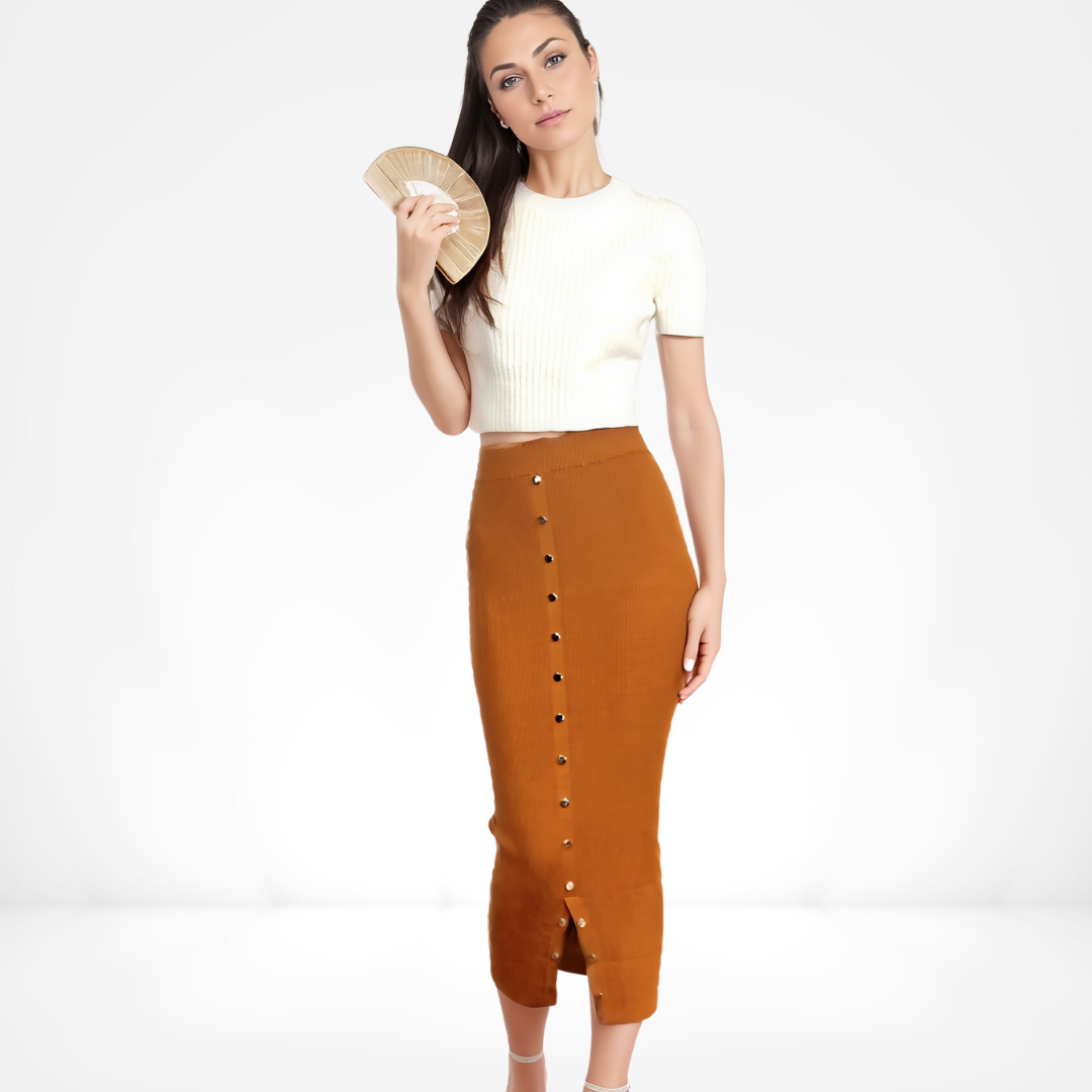 Crafted from a fine-gauge ribbed knit, the skirt gently hugs your curves, offering just the right amount of stretch for comfort and ease of movement. A line of antique-gold buttons trails from waist to hem, allowing you to adjust a subtle slit for a hint of allure. Style with a fitted ivory top and strappy heels for a chic day-to-night look, or layer under a tailored blazer and point-toe flats for polished office elegance.