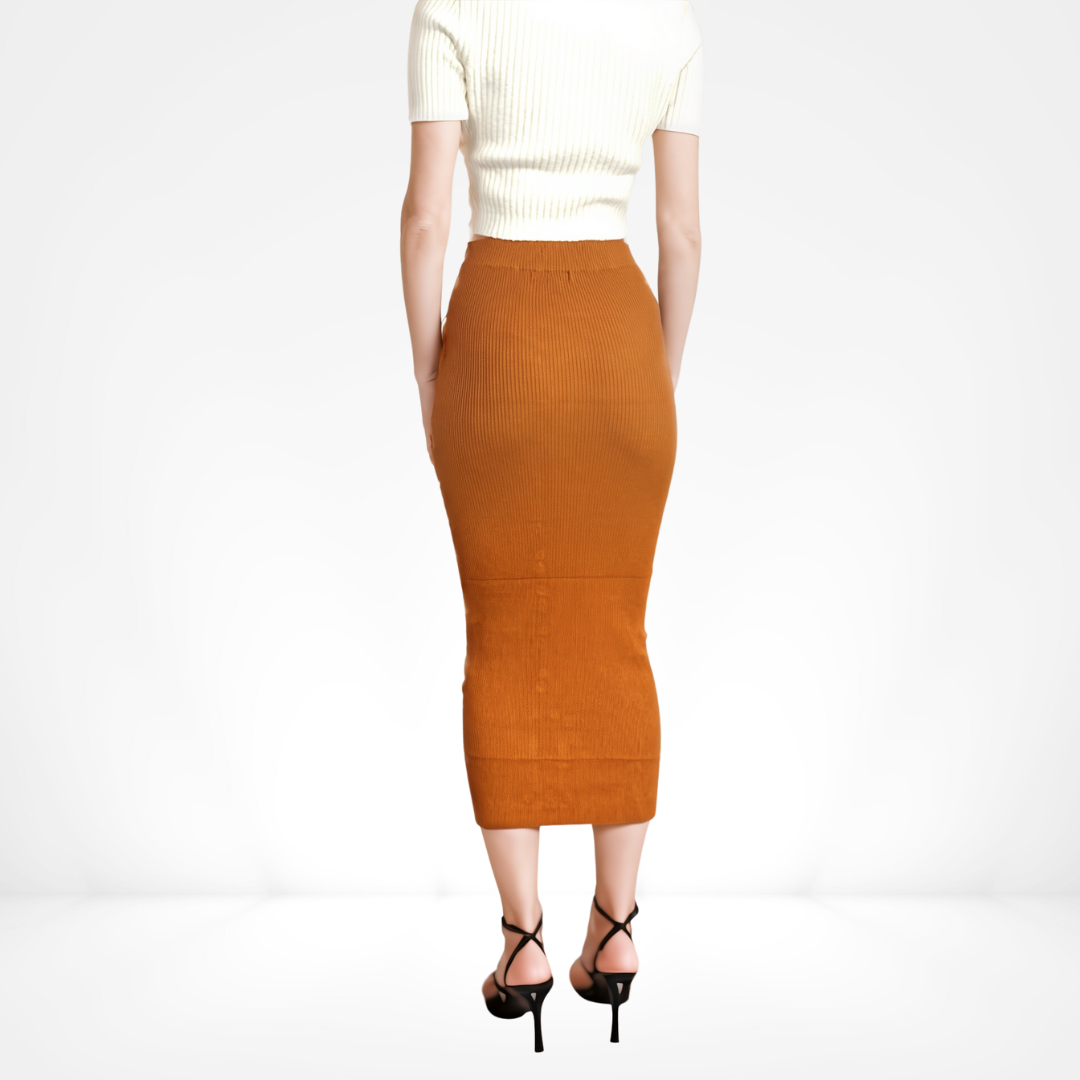 Step into a sunlit courtyard in this Amber Cascade Midi Skirt, where the warm caramel hue shimmers like autumn light on cobblestones. Perfect for an al fresco lunch or an evening gallery opening, its length and lean silhouette evoke quiet confidence and effortless refinement.