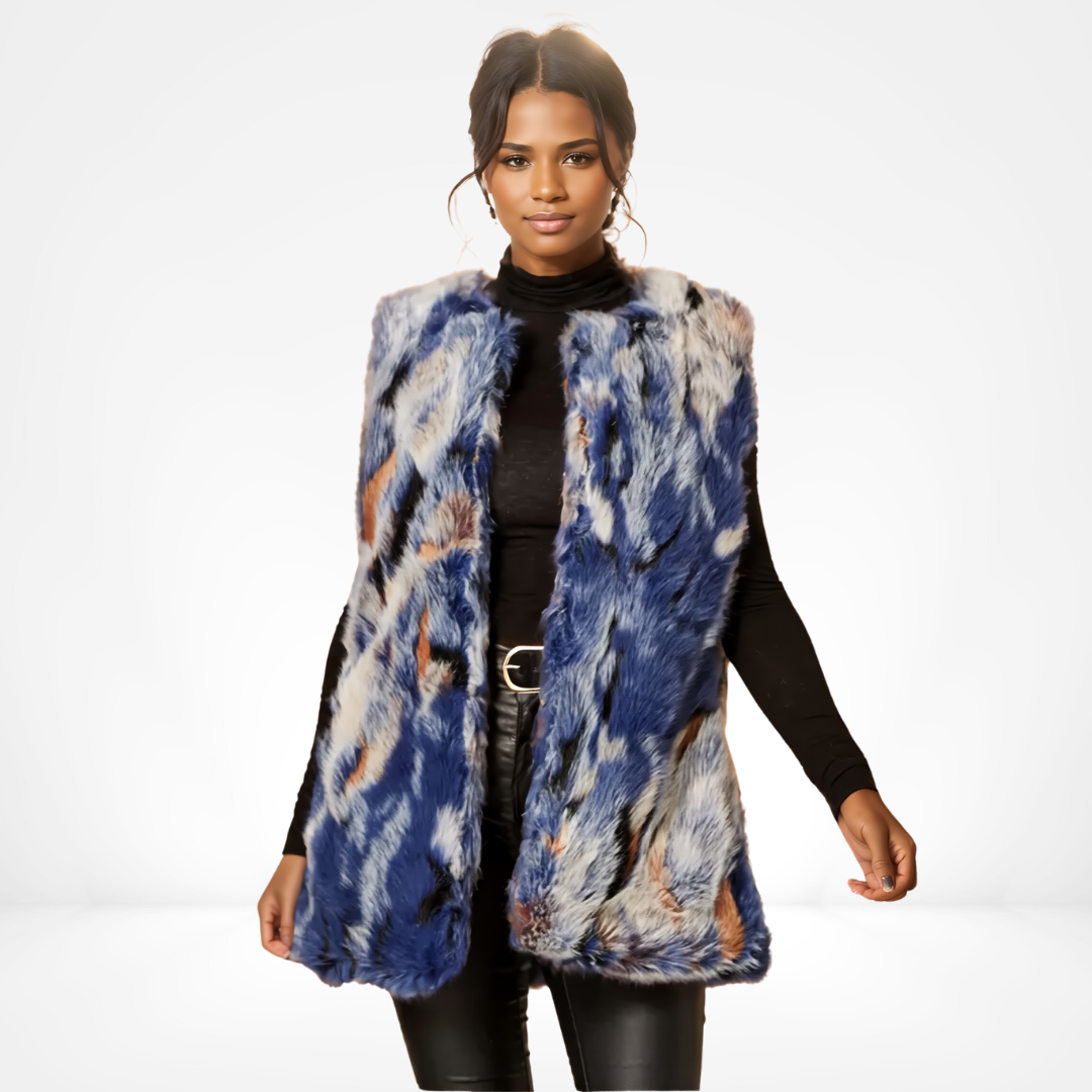 Crafted from sumptuously plush faux fur in an abstract pattern of cerulean, dove gray, and amber accents, this vest offers a relaxed, mid-thigh fit that flatters every figure. The open-front design allows easy layering over sleek turtlenecks or silk blouses, while the silky satin lining ensures a gentle glide over your ensemble. Pair it with tailored leather trousers and minimalist pumps for an effortlessly chic finish.