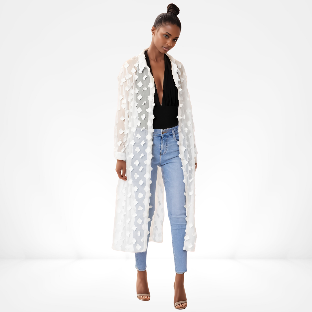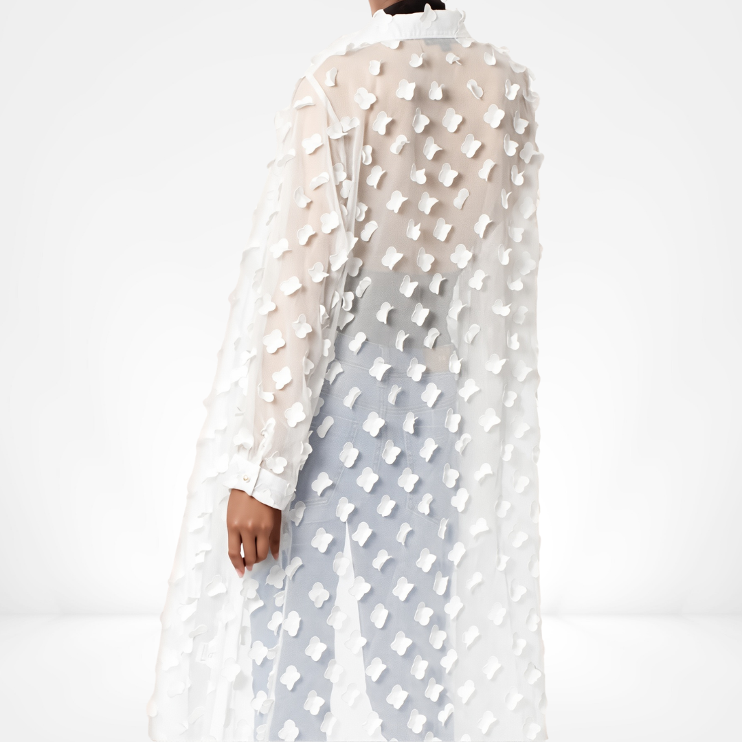 Step into warm twilight gatherings with this ethereal Clover Whisper Duster, where whisper-thin white chiffon drapes like moonlight across your silhouette. Ideal for seaside soirées or urban rooftop evenings, its delicate three-dimensional clover appliqués catch every flicker of light, imbuing your look with effortless luminosity and refined charm.
