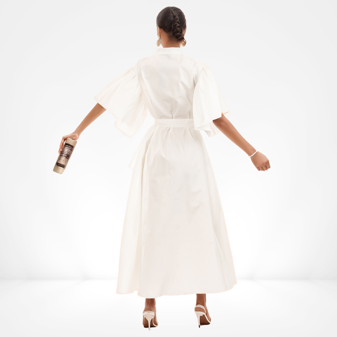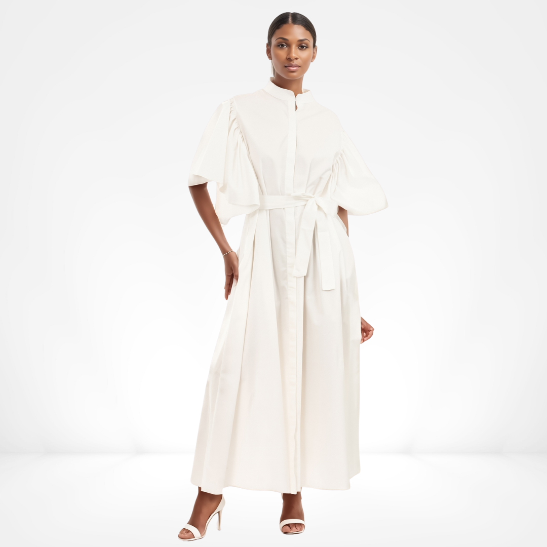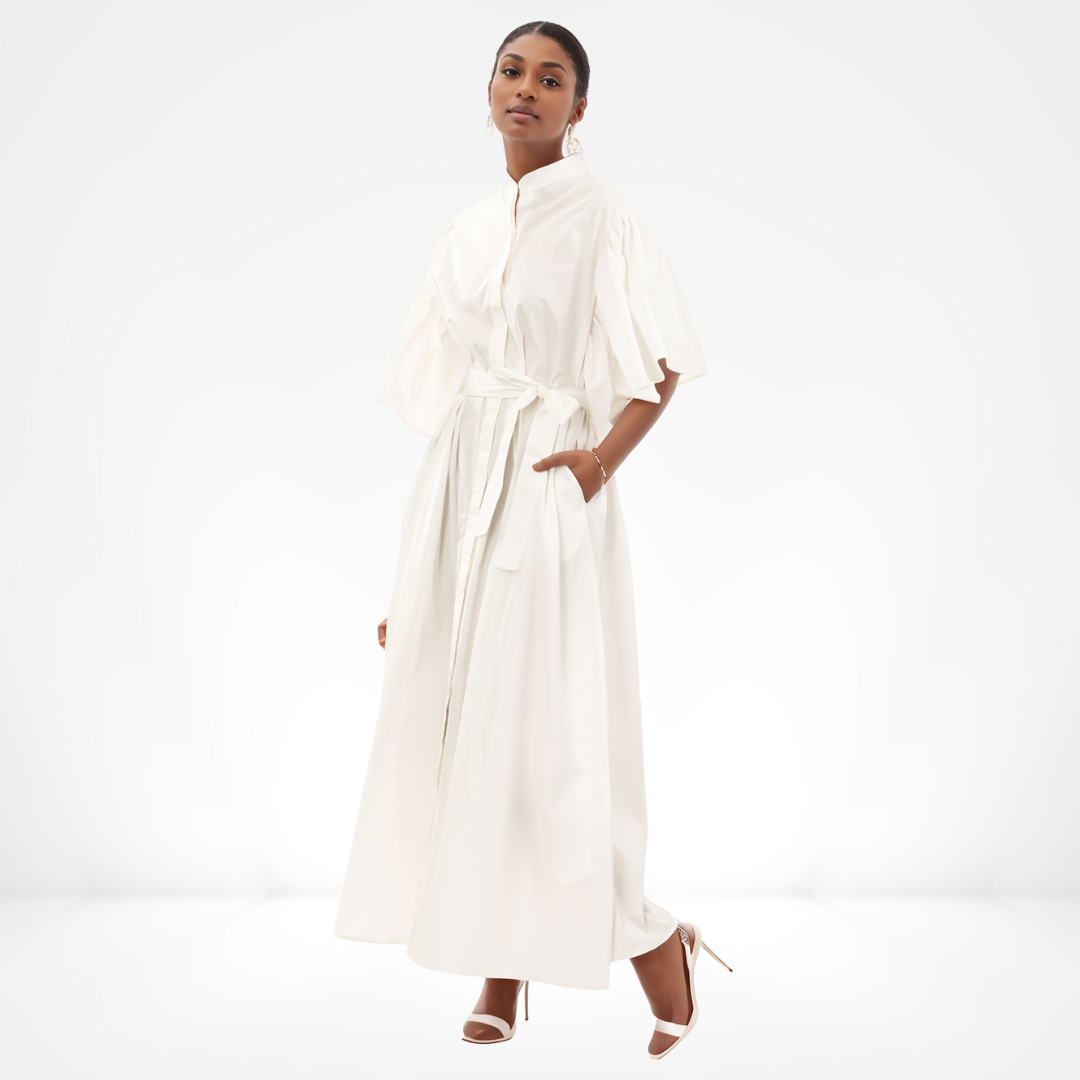 Expertly cut from a smooth cotton-poplin blend, this ankle-length gown features a streamlined mandarin collar and hidden button placket for a seamless, modern profile. Flared flutter sleeves drape like petals in motion, while the self-tie belt sculpts the waist in a flattering A-line sweep. Tuck in a pair of gold-tone hoops, slip on strappy sandals, and allow the deep side pockets to house your essentials with understated ease.