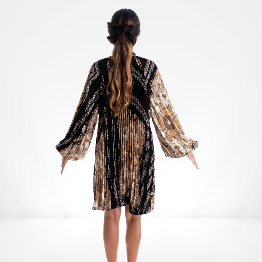 Crafted from whisper-light pleated fabric, the A-line cut gently skims the body, offering graceful ease and subtle volume. Long, billowing bishop sleeves gather at slender elastic cuffs, while a refined mock neckline fastens with a delicate tie, creating a soft keyhole reveal. The rich baroque print evokes aged gilded tapestries, making it effortless to style with strappy metallic heels, a lacquered clutch, and minimal gemstone jewelry for a polished finish.