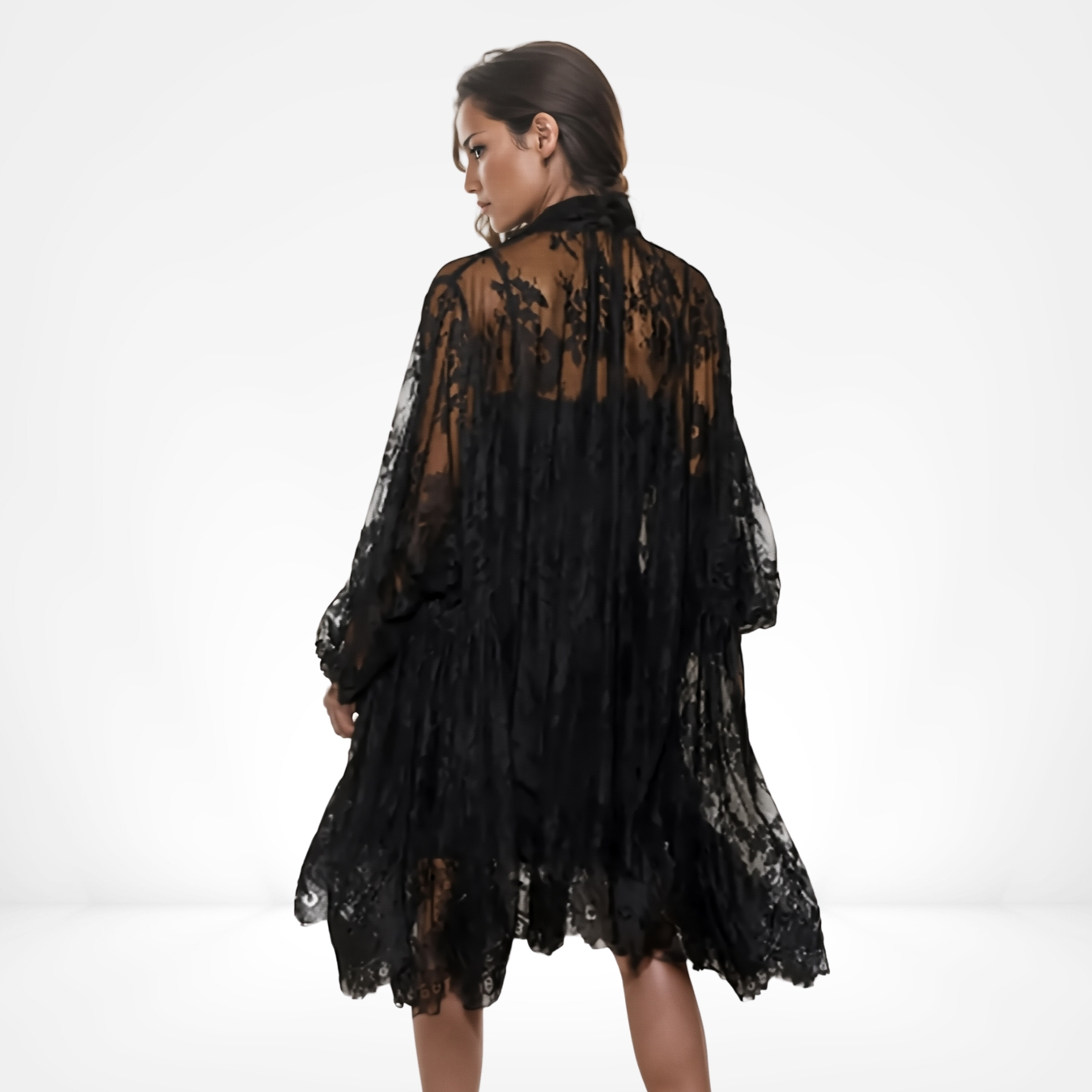 Embrace romantic elegance with our Midnight Bloom Lace Tunic Dress. This captivating dress features intricate black lace layered over a soft lining, creating a delicate yet dramatic look. The flowing tunic silhouette offers a relaxed fit, while the sheer sleeves and ruffled hem add a touch of bohemian charm.