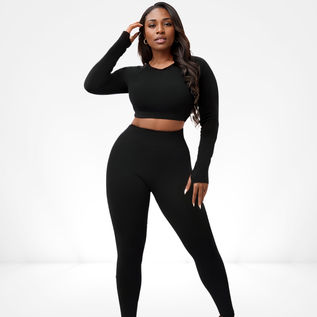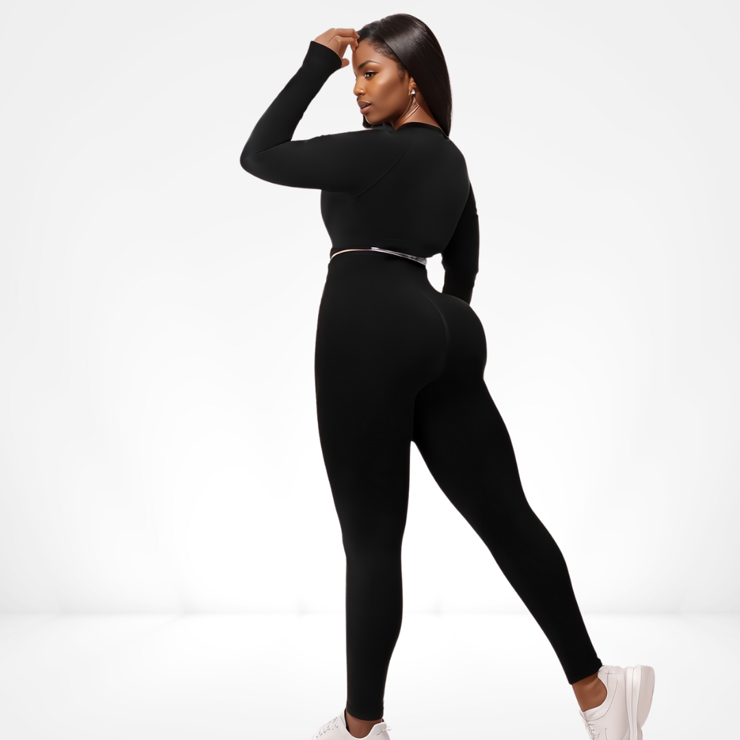 Crafted from a whisper-soft, four-way stretch fabric, the long-sleeve crop top and high-waisted leggings work in harmony to sculpt and support. The smooth, seamless construction glides over curves without distraction, while moisture-wicking technology keeps you cool under pressure. Style with metallic hoop earrings and sleek slip-on trainers for a minimalist statement, or layer under an oversized blazer for a bold street-ready twist.