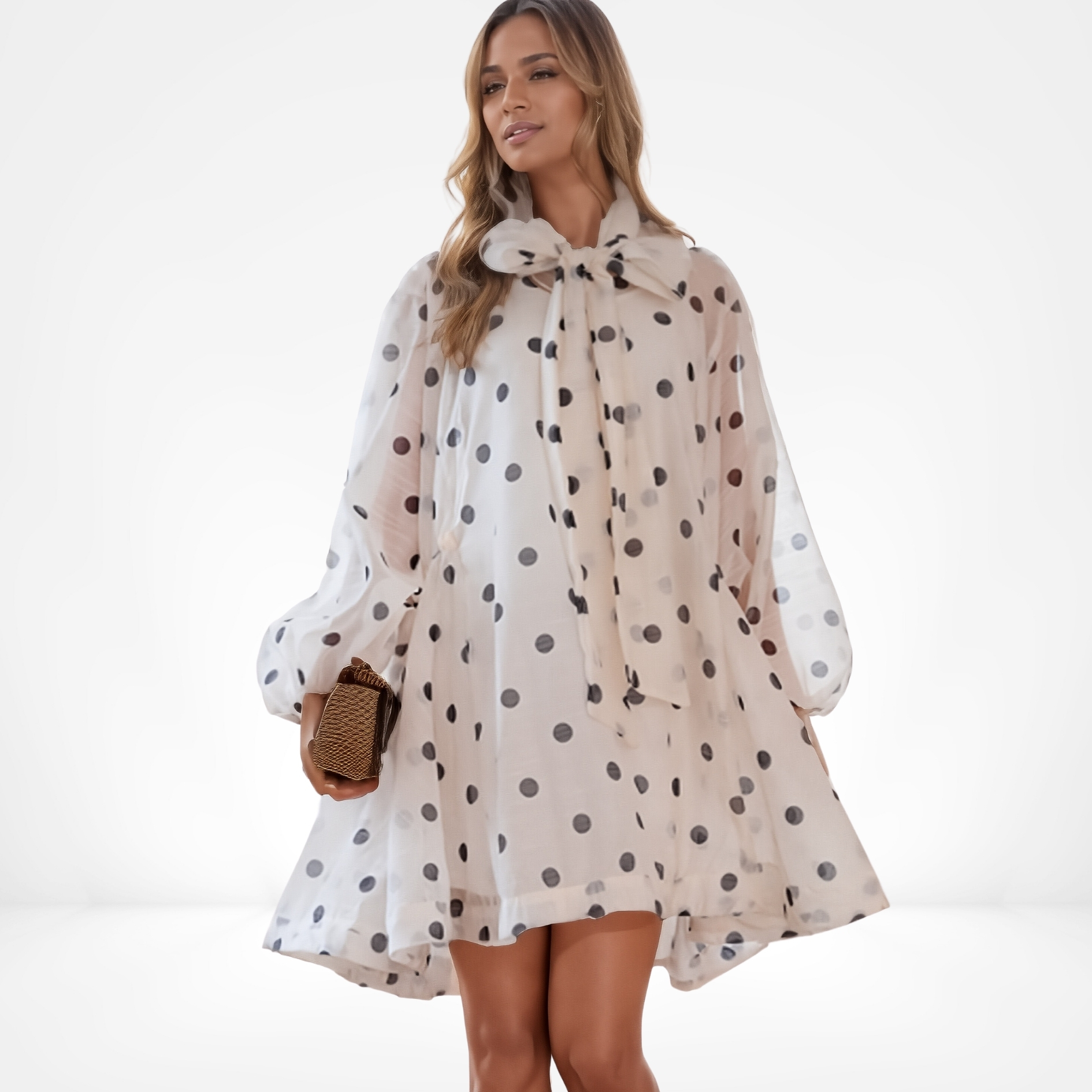 Embrace playful sophistication with our Ivory Polka Dot Tie-Neck Mini Dress. This charming dress features a classic polka dot pattern on a lightweight, flowing fabric, creating a whimsical and stylish look. The tie-neck detail adds a touch of elegance, while the mini length keeps it modern and fun.